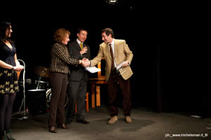 Il premio Miglior attrice è stato attribuito a Ilaria Verdini della Compagnia C.L.A.E.T. di Palombina Nuova (Ancona) per l’interpretazione del personaggio di Laura in Xanax di Angelo Longoni, per la regia di Davide Giovagnetti; il Premio Miglior Attore è andato a Paolo Capozzo e Maurizio Picariello della Compagnia Co.C.I.S. di Avellino per l’interpretazione dei personaggi di Compa Prisco e Compa Mostino in Storie di terra, di suoni e di rumori di Paolo Capozzo, per la regia di Gianni Di Nardo. I giovani delle scuole superiori di Salerno hanno premiato lo spettacolo Maria Barbella “dal braccio della morte alla vita” di Davide Di Prima, Francesca Evangelista, Adriano Nubile, messo in scena dalla Compagnia Senzateatro di Ferrandina (Matera) per la regia di Adriano Nubile e Davide Di Prima. Lo spettacolo premiato dagli studenti del D.A.Vi.Mus. è stato “Storie di terra, di suoni e di rumori” di Paolo Capozzo, messo in scena dalla Compagnia Co.C.I.S. di Avellino per la regia di Gianni di Nardo. Premio Migliore Regia del II° Festival di Teatro XS è stato per Raffaele Montagnoli della Compagnia Apothemateatrodanza di Orbassano (Torino) per la regia dello spettacolo La Flor…, tratto da L’uomo dal fiore in bocca di Luigi Pirandello. Nel corso della serata è stata consegnata una targa di partecipazione alla compagnia Teatro delle Botteghelle che il 7 marzo ha rappresentato fuori concorso Il baciamano di Manlio Santanelli. A giudicare i lavori è stata un’apposita giuria presieduta da Caterina Cimino, dirigente scolastico dell’ITC “A. Genovesi” di Salerno, e composta da Geppino Gentile (in rappresentanza del D.A.Vi.Mu.S.), Pina Russo Pirollo (per il Salerno Soroptimist Club), Carmela Tavernise (per il Lions Club “Salerno Hippocratica Civitas”), Marisa e Carmine Tavarone, Emilia Alfinito, Roberto Lombardi (Compagnia dell’Eclissi) e Raul Apicella (Compagnia dell’Eclissi). |
